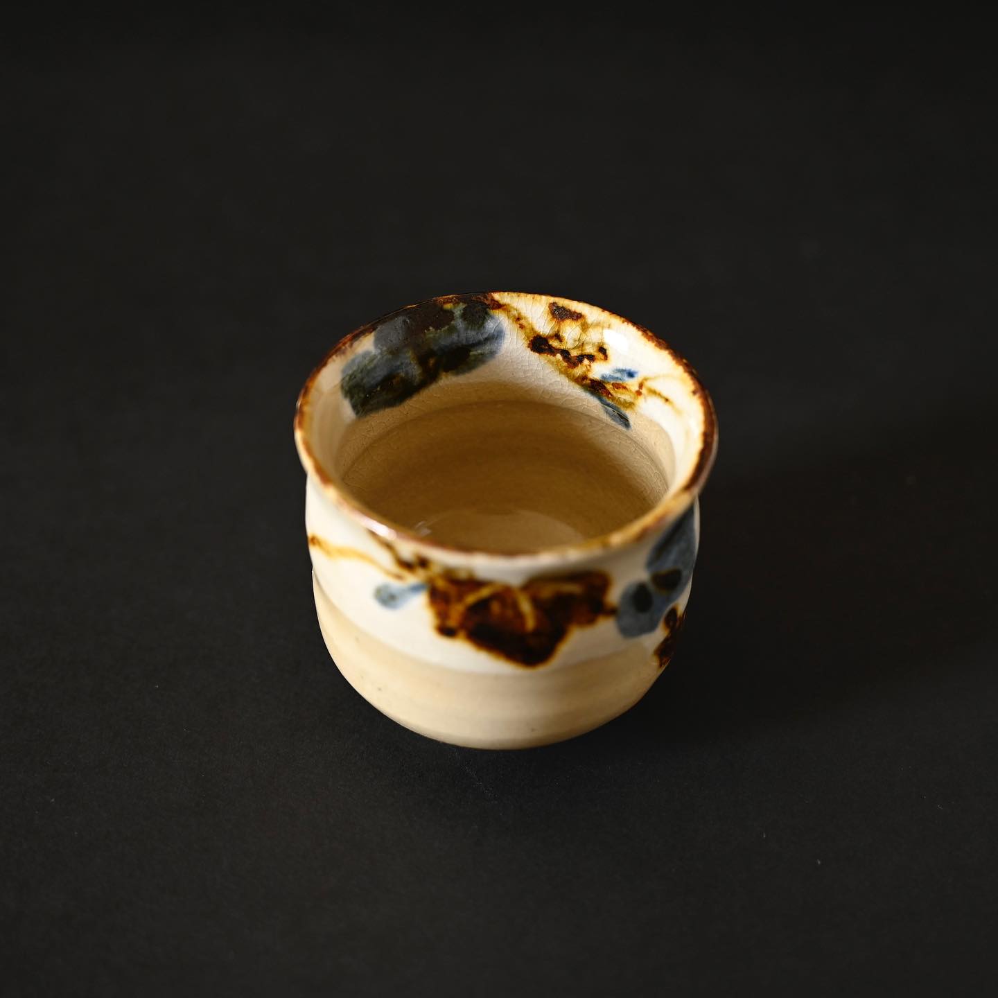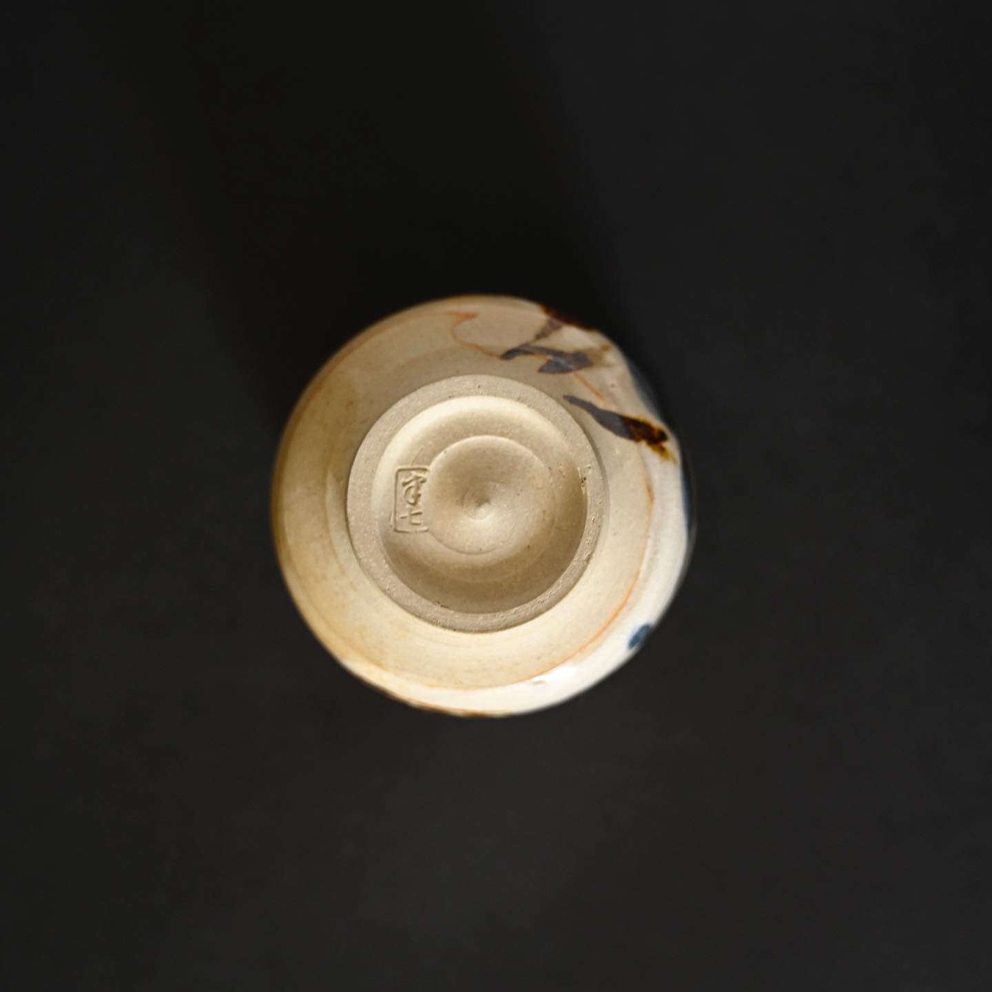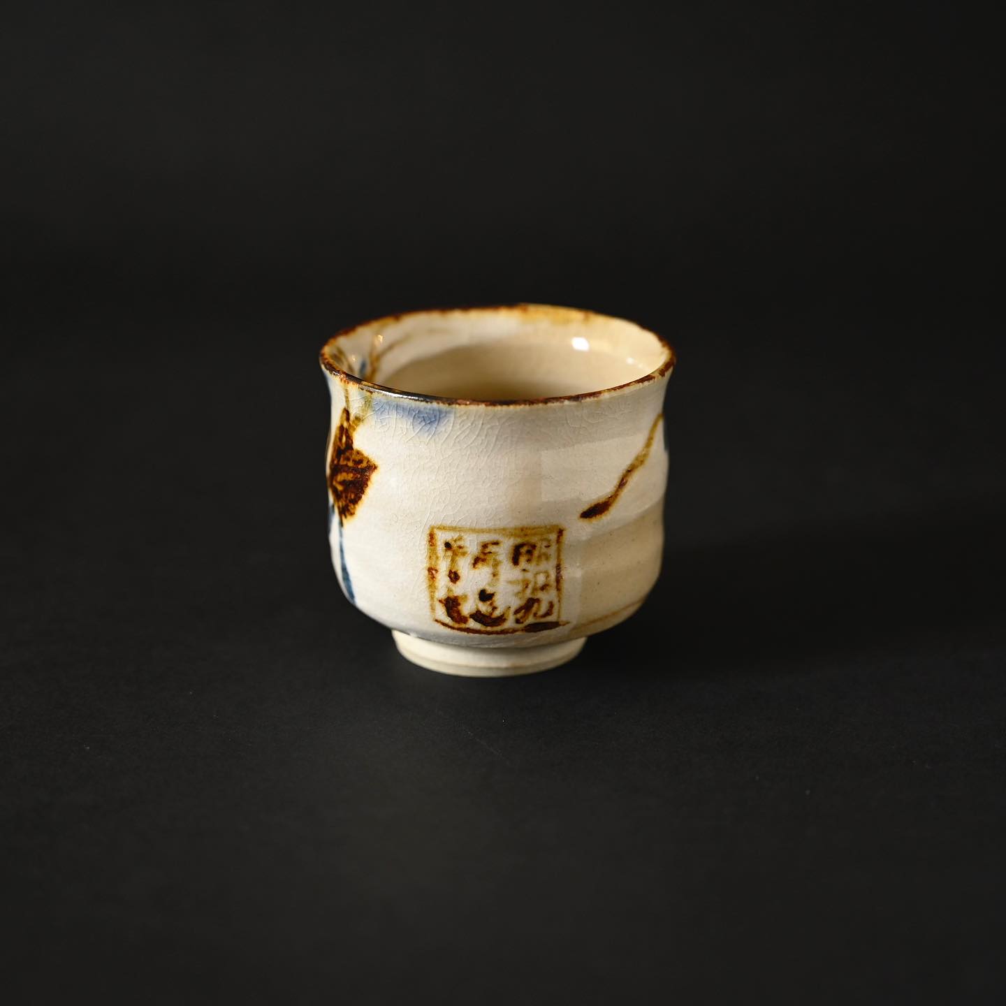 夕顔の盃ですが、ゆったりとした轆轤目の器に白化粧を施し、その上に呉須と鉄薬で大振りな夕顔の葉と、まだまだ細い、きゅうりのような瓢箪が描かれています。年記のこともあり、なんだかちょっと意味深な盃です。上がりも美しい優品ですが、それ以上に作品の背景が気になる面白い一品です。